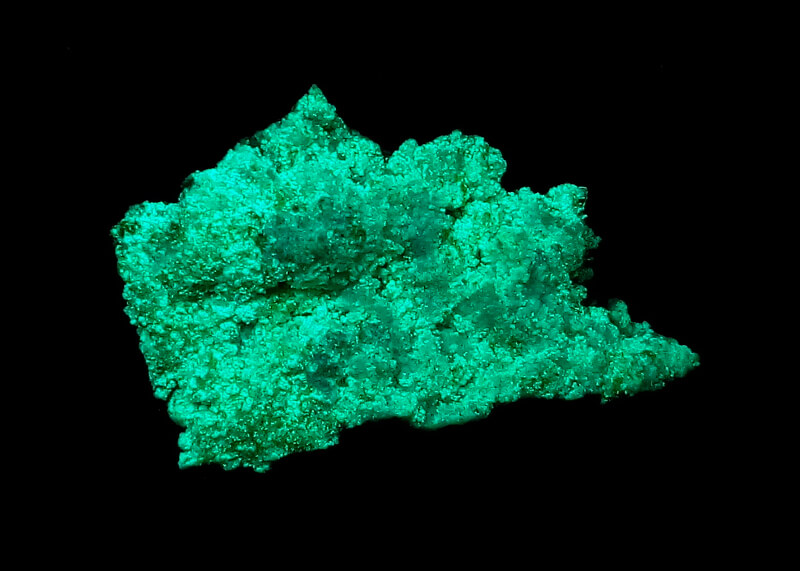Almost all of the fluorescent material from the Hideout #1 comes from the first 30 meters inside the portal. Rainwater and snow melt entering the mine adit allowed several Uranium secondaries to form evaporites on the walls of the adit.