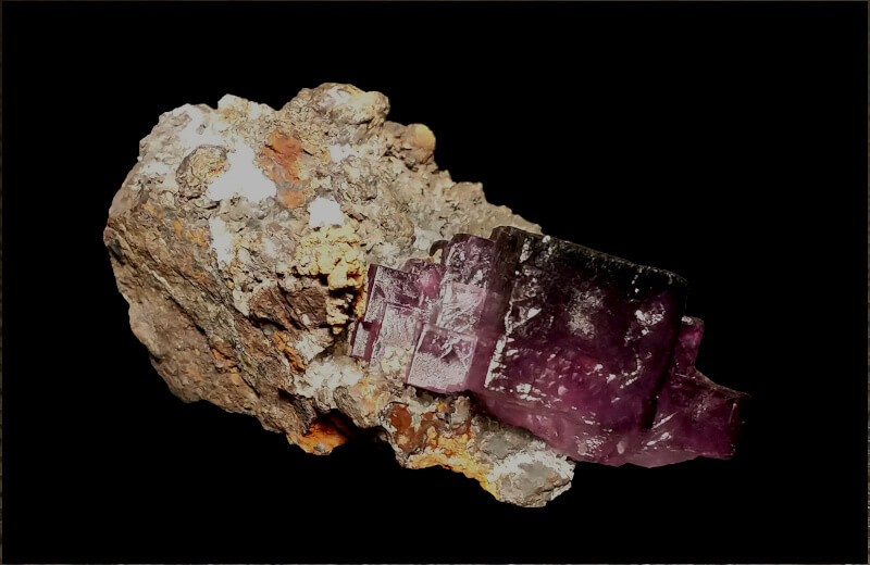 Cubic fluorite crystals on matrix. Fluorescent red and blue under longwave UV light.